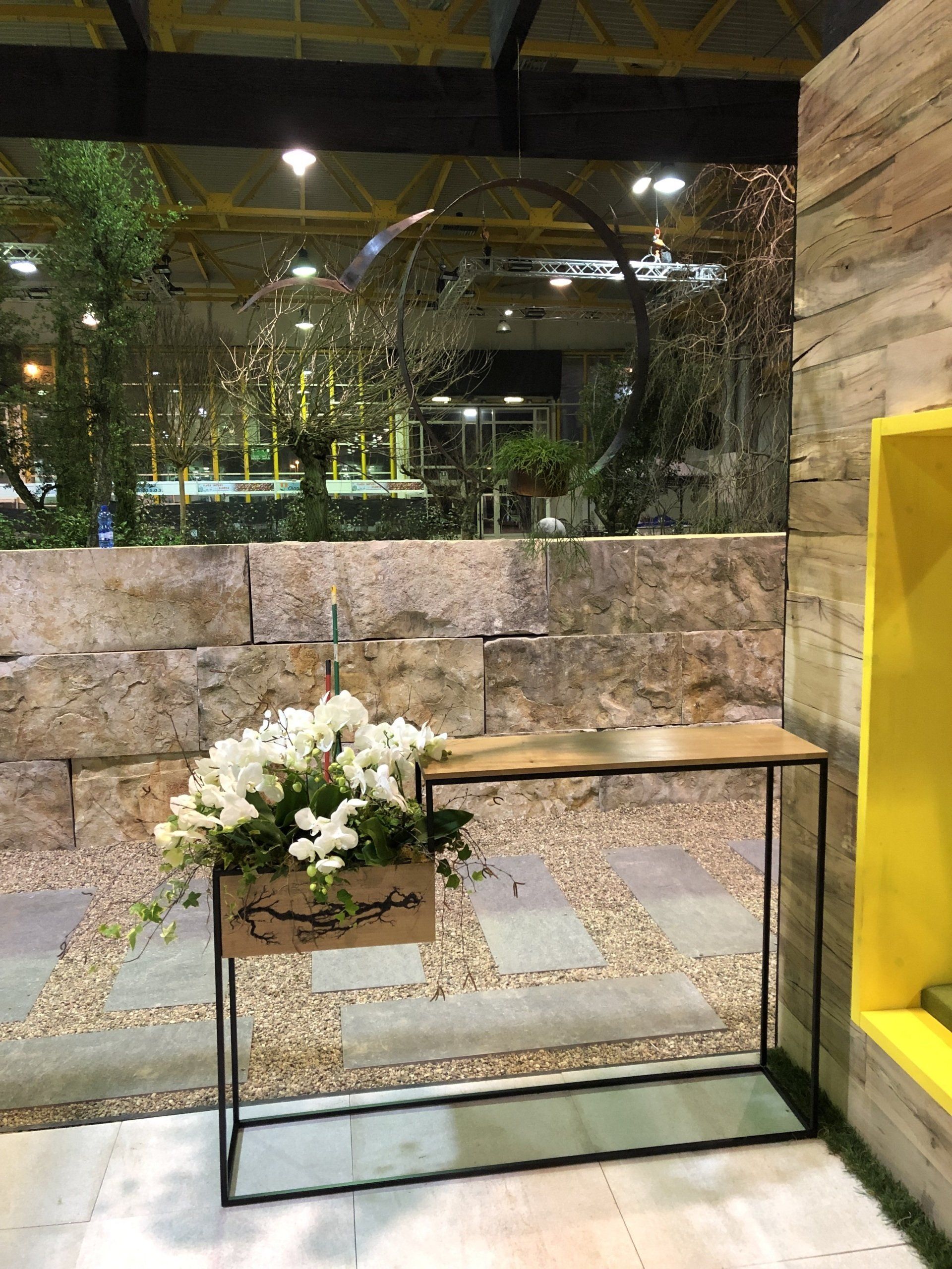 Tavolo in rovere antico e vetro dipinto a mano con struttura in metallo