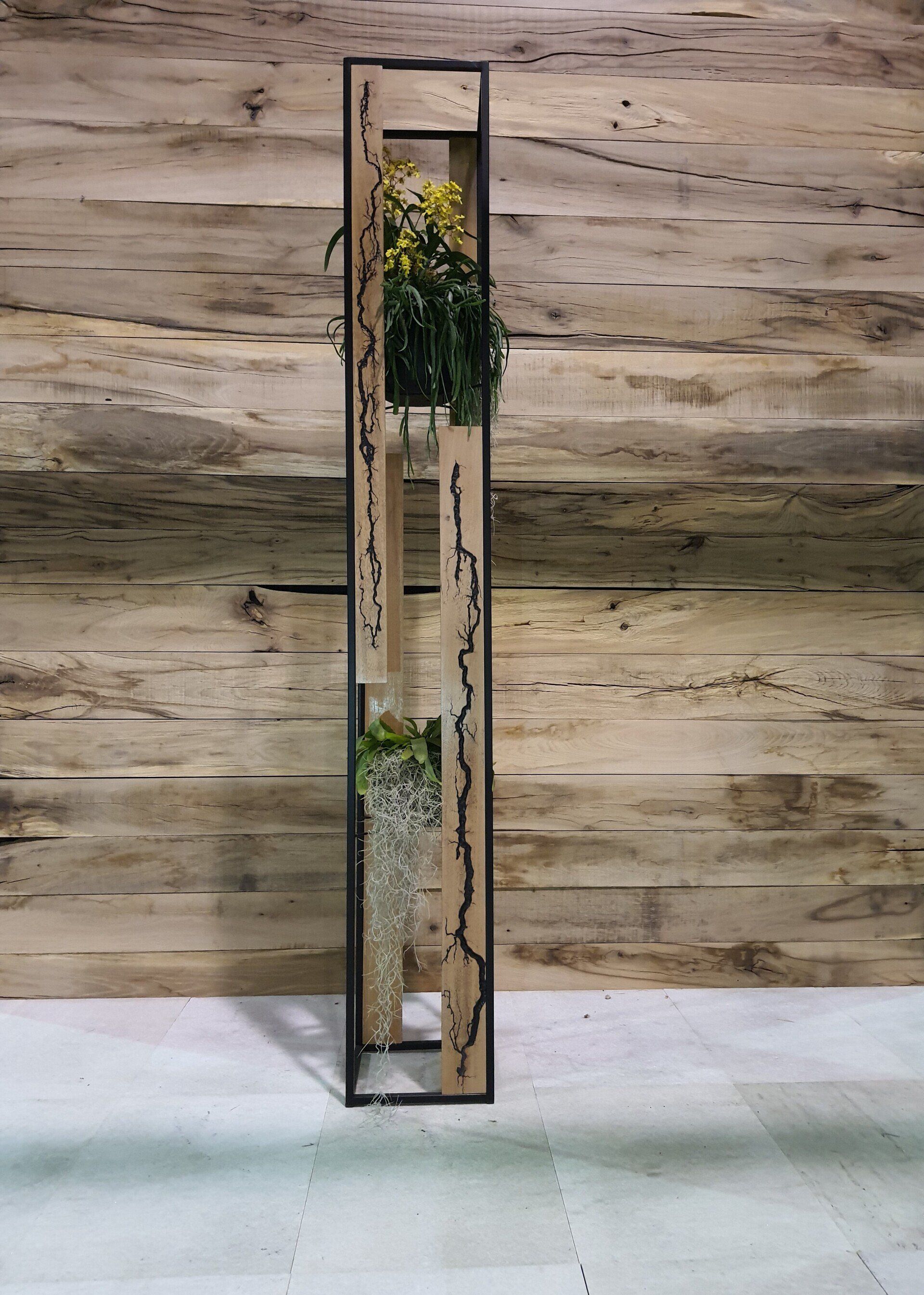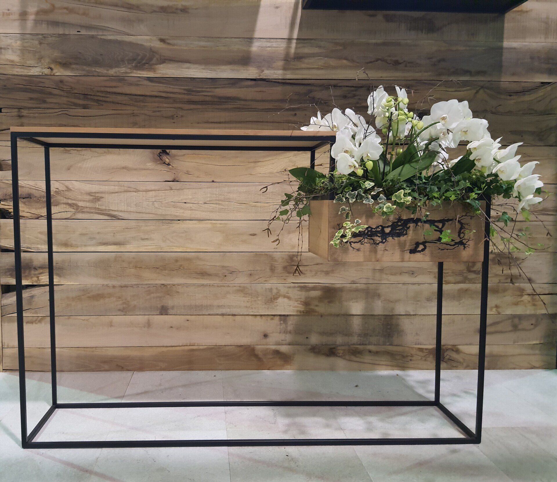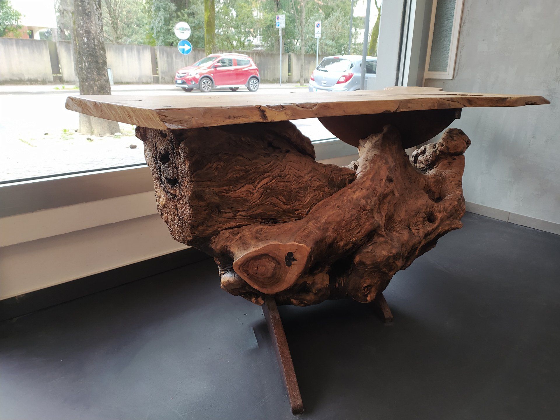 Tavolo in rovere antico e vetro dipinto a mano con struttura in metallo
